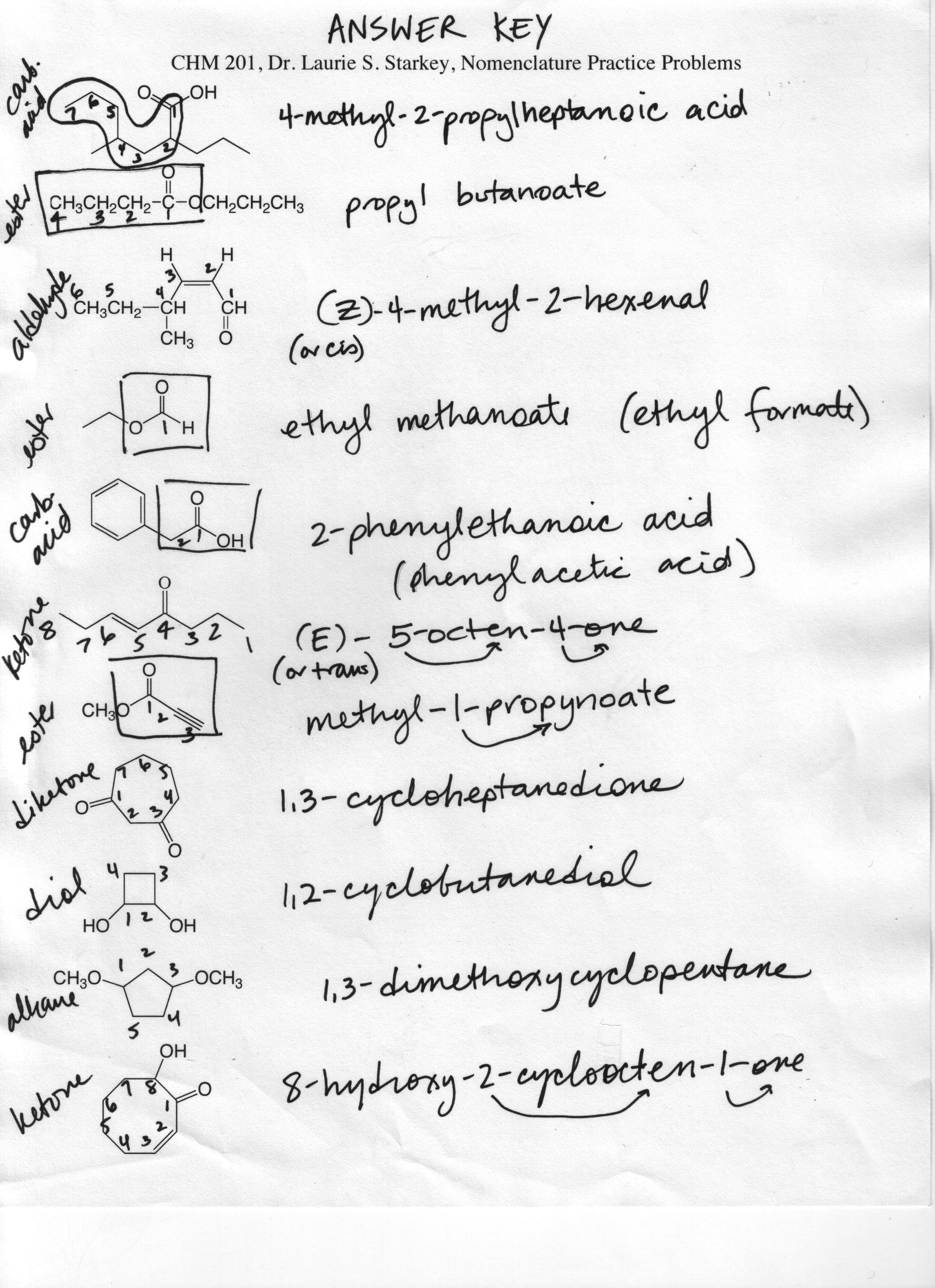 Carboxylic Acids, Esters, Ketones & Aldehydes Nomenclature practice problems and answer key
