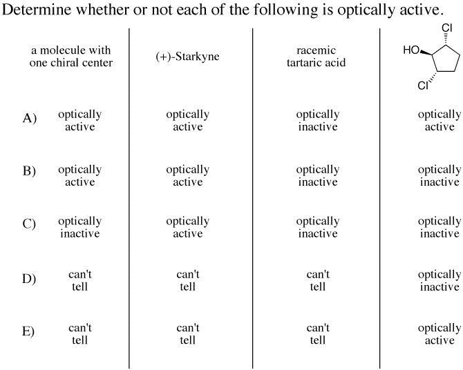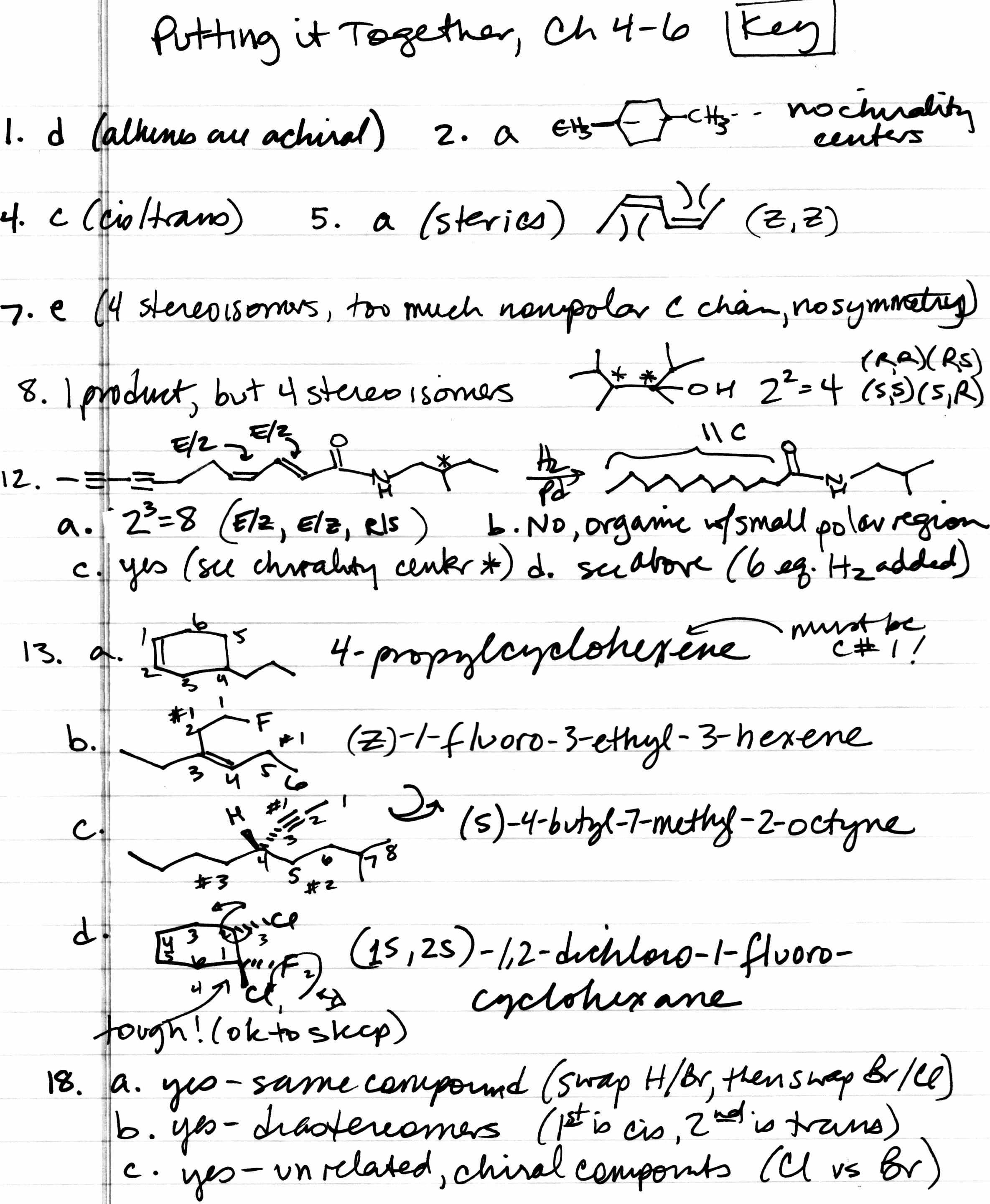 Chapter 6 Stereochemistry (lecture handout): ALL in-chapter problems 1-6, Quick Quiz and odd end-of-chapter problems 7-45 (SKIP problems 23b, 25bd, 41 and 6th edition SKIP problem 6.2b). "Putting it Together" Chapters 4-6 (good practice, not extra credit this time...check your work with this answer key: page 1 and page 2): do problems 1, 2, 4, 5, 7, 12, 13, 18, 21bcdef, 22 (like hydration of an alkene - start by protonating the pi bond, rearranging the carbocation, and then do an intramolecular attack of a nucleophile...).